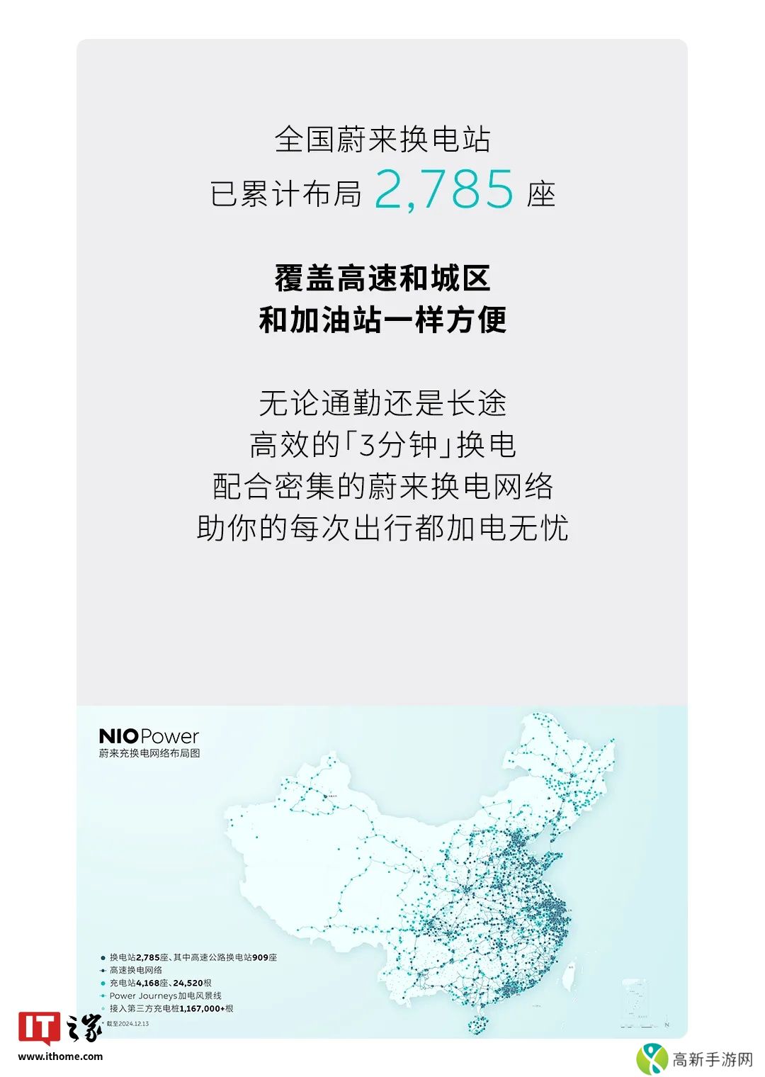 目前蔚来在全国已累计布局 2785 座换电站,其中高速公路换电站 909 座。