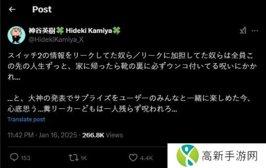 作为知名的“推特喷子”,神谷英树在Switch 2公布后于推特上怒喷了那些泄密者,并且还对泄露Switch 2的人“将下了诅咒”,他说:“我希望所有泄露Switch 2信息的人/那些帮助泄露信息的人都会受到诅咒,一辈子回家后鞋底都会沾满便便。”