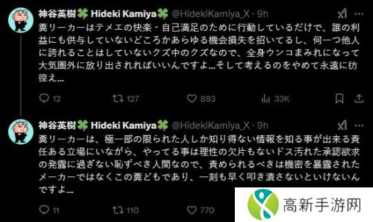 此外神谷英树还将泄密者称为“最恶劣的败类”,并且补充道:“这些个卑鄙的泄密者只为了自己的乐趣和自我满足而行动,他不仅没有为任何人谋福利,而且还遭受了各种机会损失,也没有做任何值得在别人面前骄傲的事情。他是最坏的败类,所以应该从头到脚沾满屎,把他扔出大气层……然后停止思考,永远流浪。”