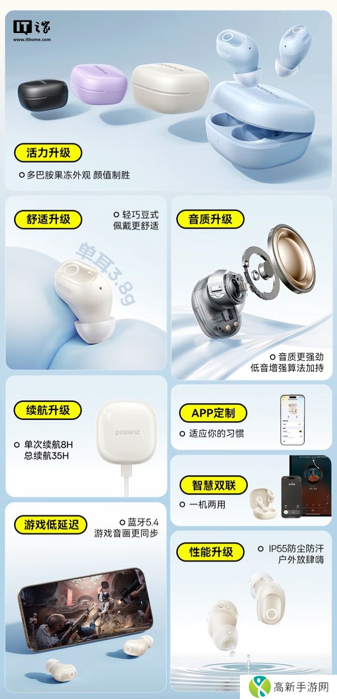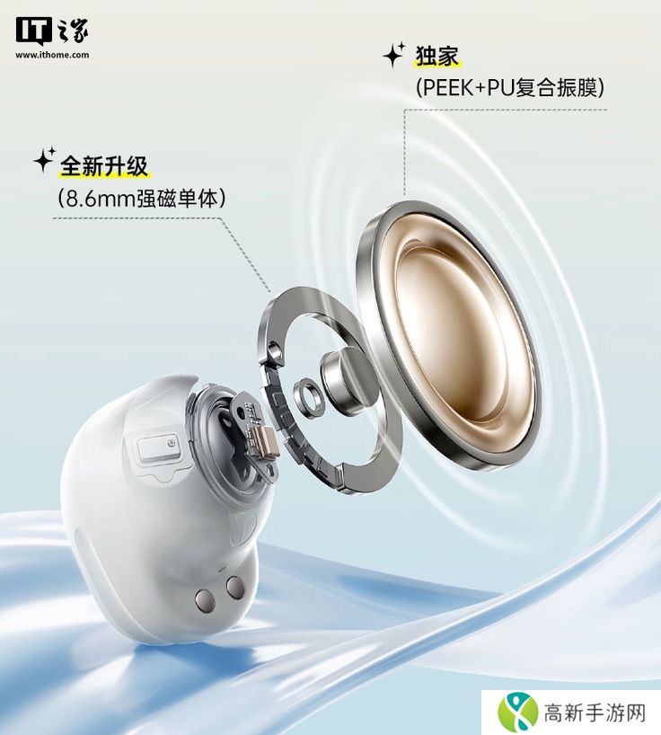 这款耳机可选星月米 / 星际黑 / 星湖蓝三种配色,耳机本体采用圆润造型,整体重量约,耳机配备 8.6mm强磁单体及PEEK+PU振膜,支持双麦克风ENC通话降噪。