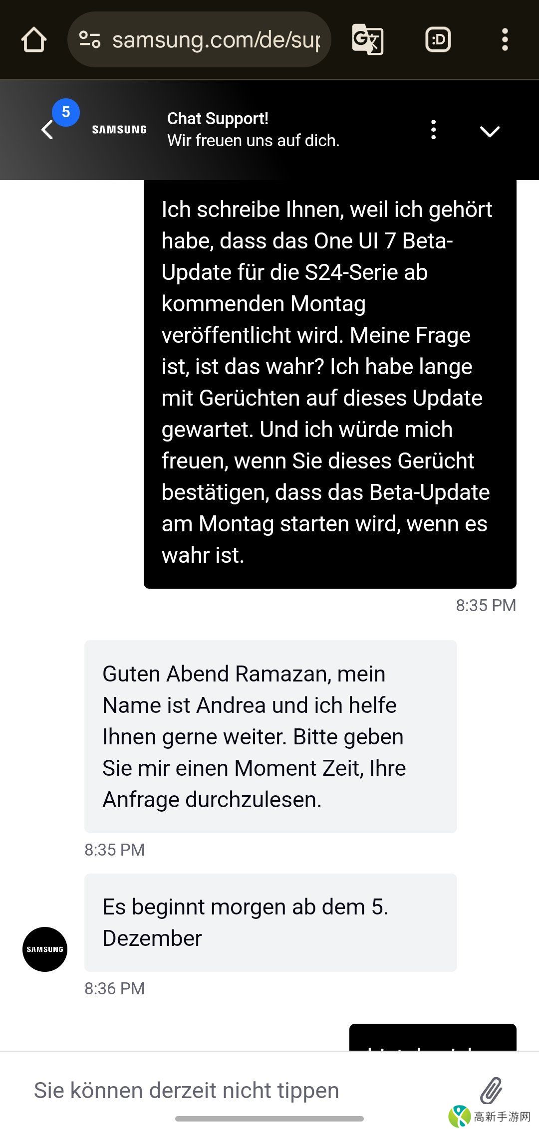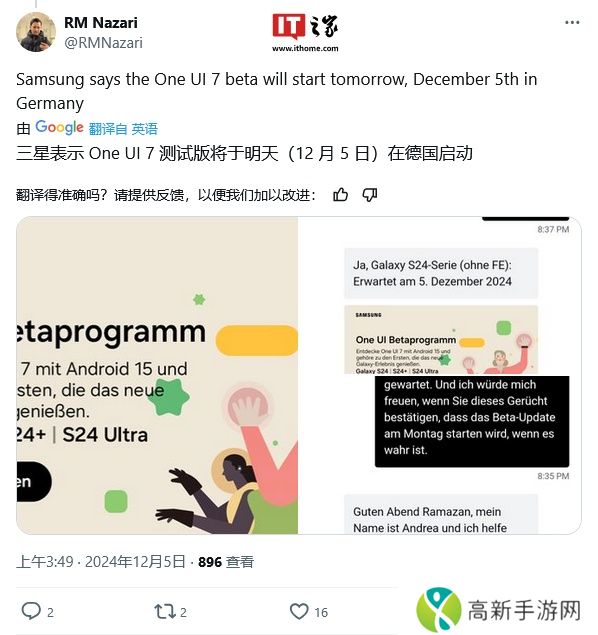 根据网友 RMNazari 在 X 平台分享的聊天截图,三星客服确认将于 12 月 5 日在德国启动 One UI 7 测试版。