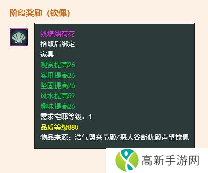 3、声望提升至“钦佩”级别时,将有机会获得【钱塘湖荷花】这一独特家具。