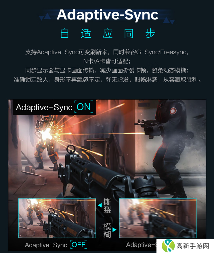 该款显示器支持 HDR 高动态范围成像,亮度最高450cd/m2,支持 Adaptive-Sync 可变刷新率,兼容 G-Sync / Freesync,适配 N 卡 / A 卡使用。