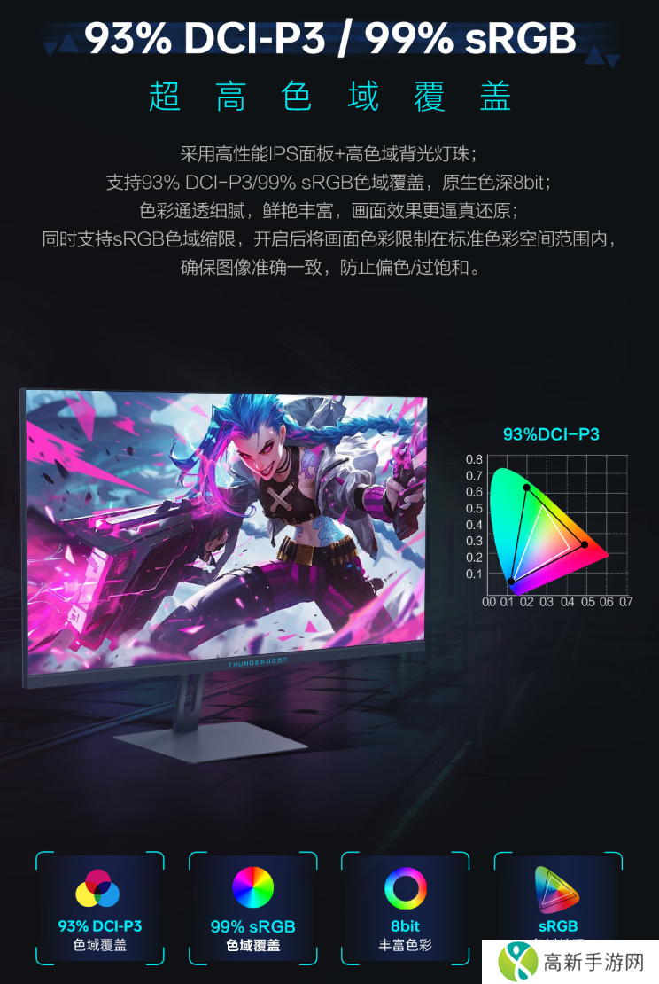 雷神黑武士“CF25F300”显示器支持93% DCI-P3、99% sRGB色域覆盖,原生色深 8bit,提供 sRGB 色域缩限。显示器出厂校色,色准 ΔE<2。