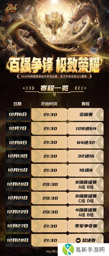 本次冬季挑战赛,汇聚了来自各大服务器的顶尖家族,他们将在接下来的一个月里,展开一场场激烈的较量。12月6日开启资格赛,4支家族为一组同台竞技。12月7日至28日进入晋级赛及决赛,首次开启全新1V1赛制,每场仅2支家族对抗,向冠军宝座发起猛烈的冲击!快来看看赛程安排吧: