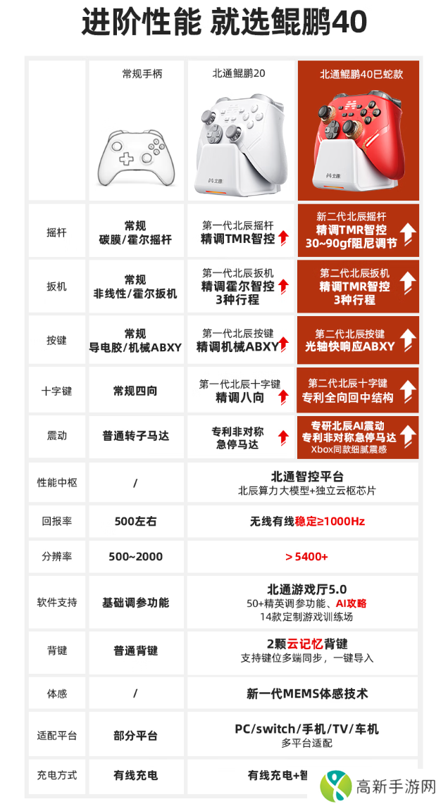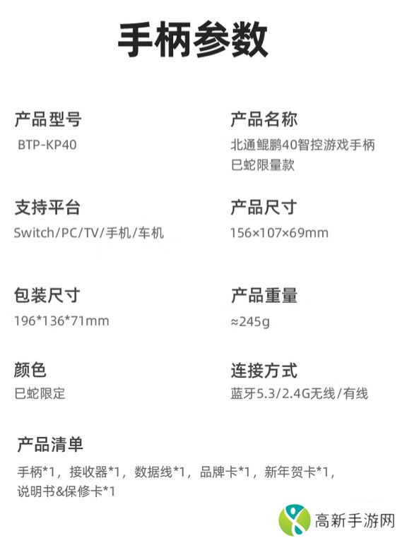 本站附北通鲲鹏40游戏手柄规格如下: