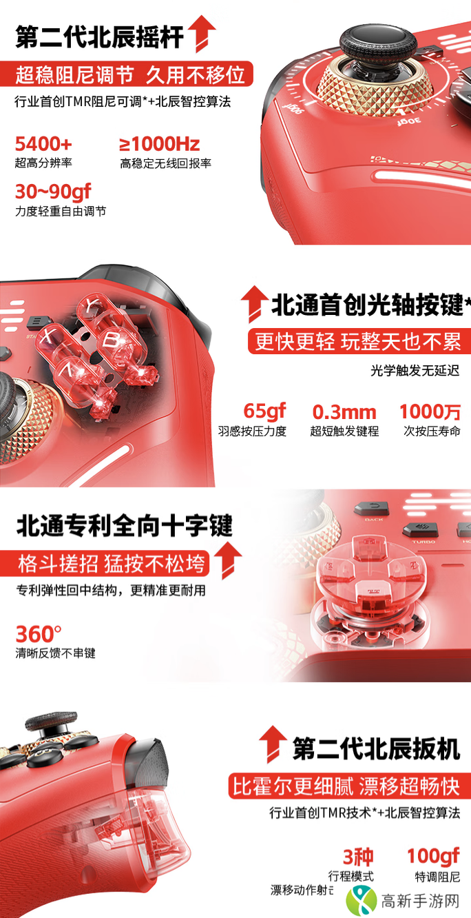 该款手柄配备 TMR阻尼可调摇杆,支持30~90gf力度调节、无线回报率≥1000Hz、分辨率5400+,拥有3种行程模式,提供100gf线性反馈。手柄配有光轴按键,按压寿命约1000万次、触发键程约0.3mm、对战快按压力度约65gf,其十字键支持360°反馈不串键、对战快触发行程0.3mm。