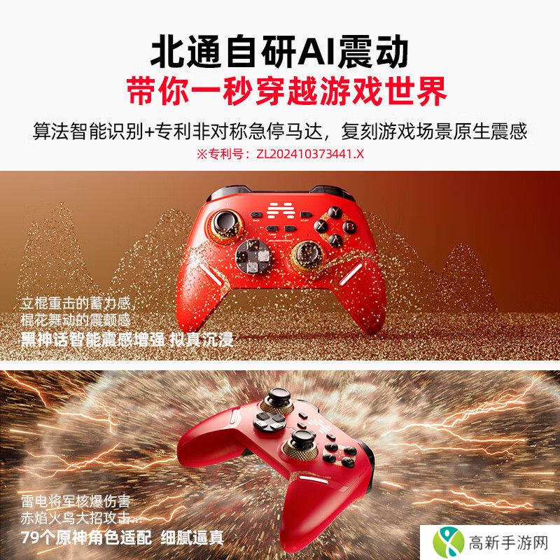 北通鲲鹏 40 手柄“巳蛇限定版”的外壳采用红色主题,印有蛇纹元素丝印;手柄摇杆和按键处均有金色点缀装饰,同时附送新年限定贺卡。
