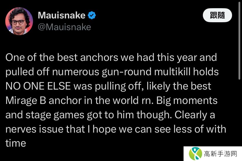 Mauisnake:Jimpphat是今年最优秀的主防者之一,成功完成了多次难以复制的多杀场面,他可能是目前最优秀的Mirage B区主防者。然而,在关键时刻和场馆比赛中,他显得有些紧张。希望随着时间的推移我们能看到他对此有所改善。