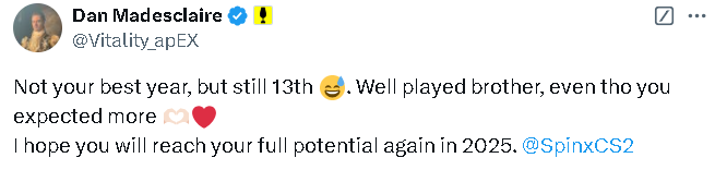 一起看看Spinx获得TOP13后社区的看法吧。apEX:虽然这一年并不是你最辉煌的一年,但仍然取得了第13名的成绩。兄弟,表现不错,尽管你期待能有更多好成绩。我希望你在2025年能再次发挥出你的全部