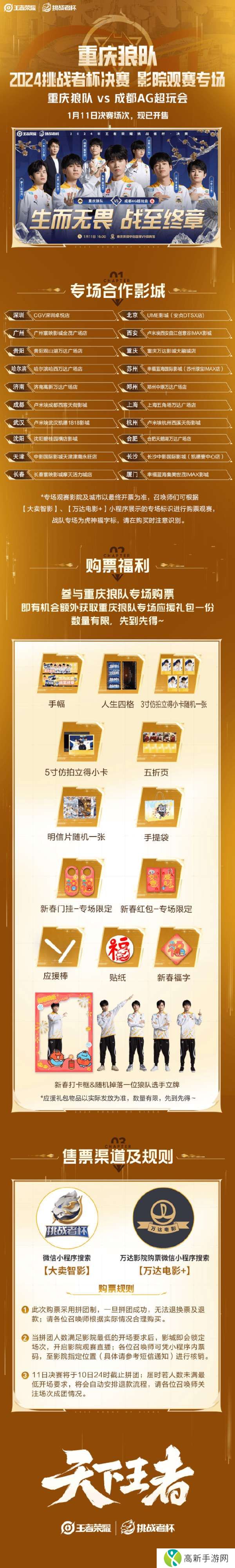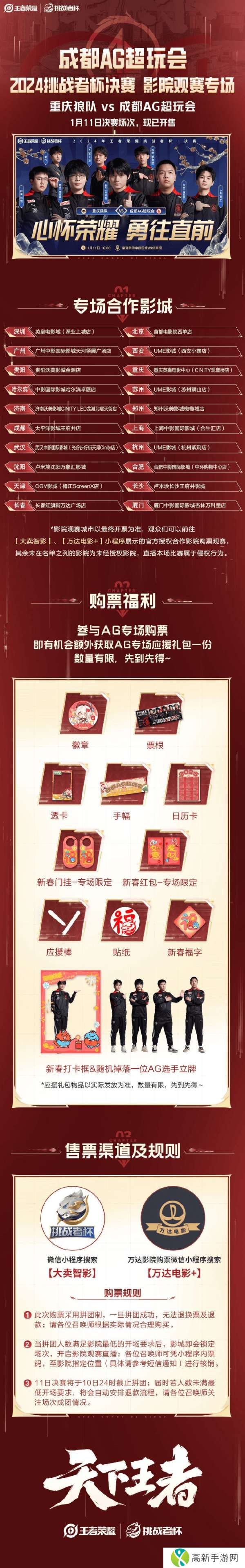 新年伊始,竞粉欢聚!2024年王者荣耀挑战者杯 进入到最激烈的决赛阶段,是成都AG超玩会 创造一个新的三连冠王朝,还是重庆狼队王者荣耀分部 加冕史无前例的十一冠王?K妹希望能把这期待与激情带到各位召唤师的家门口,本次将继续推出KPL沉浸式影院观赛活动,即使无法身处比赛现场,也能感受到比赛主场的氛围~王者荣耀职业电竞史上首次BO9大战,让我们一同见证,一起欢呼,共享燃爆的精彩瞬间!