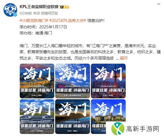 虎扑01月13日讯 选秀大会信息出炉:1月17日,南通海门,一起见证状元的诞生原文如下:2025KPL选秀大会 信息出炉!举办时间:2025年1月17日举办地:南通·海门海门,万里长江入海口最年轻的城