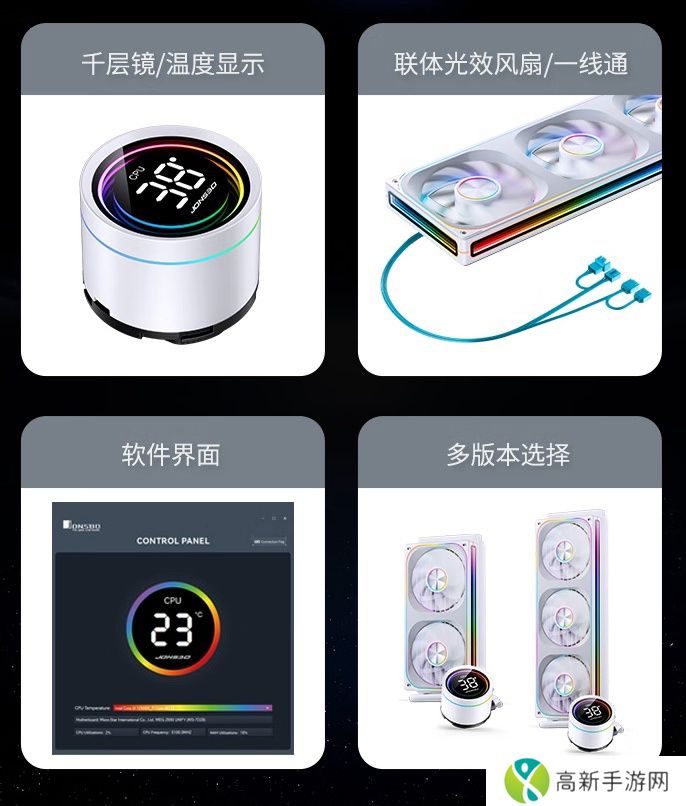 系列散热器配备联体 PWM 风扇,带有RGB灯,号称可实现“360 度四面镜光效”,风扇转速 700-2400rpm,风量 21.46-62,4CFM,噪音 21.3-37.3dBA。