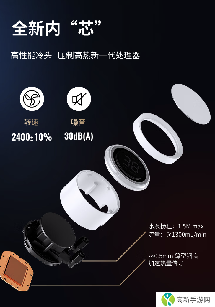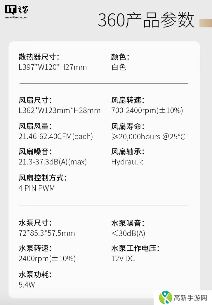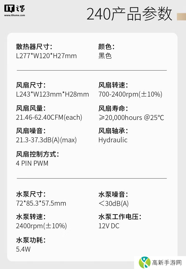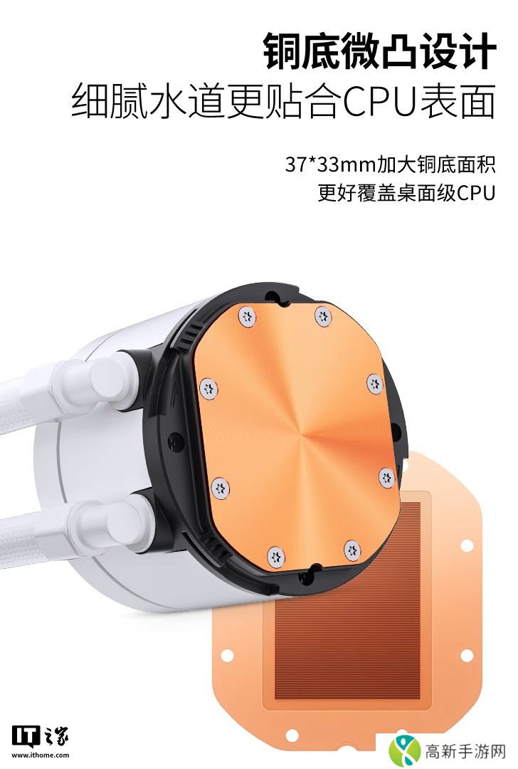 系列散热器采用全新水泵系统,水泵转速 2400rpm,最高噪音 30 分贝,铜底面积37x33mm,使用 EPDM+IIR 水冷管。
