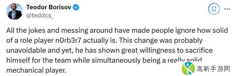 “说实话,n0rb3r7理应得到比VP更好的待遇……2023年初他们就把他下放替补席,后来他又证明了自己能重回战队,而现在问题根本不在他身上。VP这步棋真的太蠢了。 ”