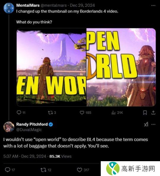 采用虚幻5引擎打造的动作射击游戏《无主之地4》将在2025年年内推出。近日开发商Gearbox的首席执行官Randy Pitchford在推特上纠正了将《无主之地4》称之为开放世界的说法,并表示&ld