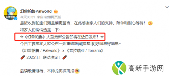 就在今日,《幻兽帕鲁》正式确认将联动《泰拉瑞亚》,具体联动活动预计会在2025年推出。这则公告的发布,也令无数玩家感慨万分。毕竟过去的几个月,《幻兽帕鲁》已经遇冷很久了。