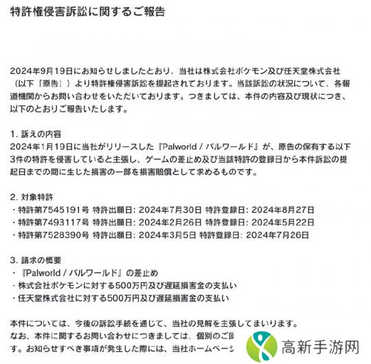 今年9月,任天堂联合宝可梦公司以专利侵权为由,对《幻兽帕鲁》开发商Pocket Pair提起了诉讼,要求禁止该游戏继续运营,并索赔自相关专利登记日起至诉讼提起日期间产生的部分损失、支付给任天堂和宝可梦公司各500万日元。
