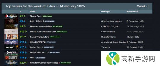 《怪物猎人:荒野》、《文明7》以及《天国拯救2》,都是即将发布的作品。凭借在前作的好口碑,得到了广大玩家的关注。《三男一狗5》、《腐蚀》则属于发布已久的经典游戏,近期重新回归了榜单。
