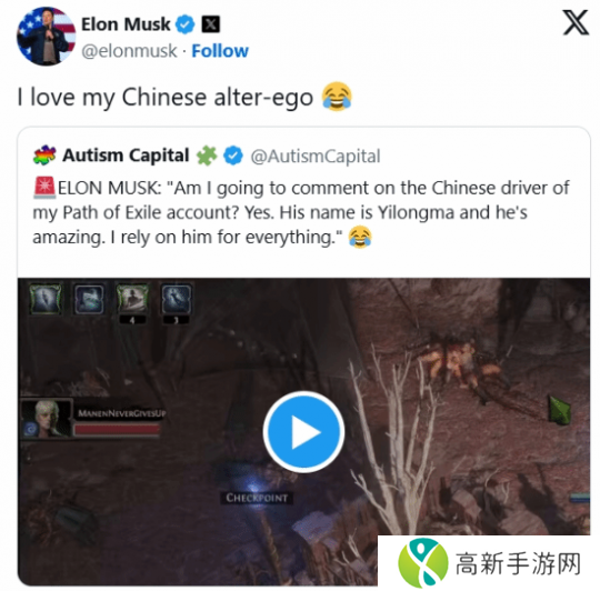 时隔数日,马斯克终于对这件事进行了回应。日前,他在直播《流放之路2》时坦白,自己确实请了个中国游戏代练:“他叫伊隆马,他非常棒。我所有的事情都依赖他。”不久后,其本人在X上也同步了这则动态。
