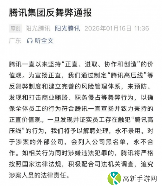 腾讯表示,一旦员工被发现触犯“腾讯高压线”,将立即解雇,并且永不再次录用。同时,涉案的外部公司将被列入黑名单,禁止合作。如相关行为同时涉及违法犯罪,腾讯将严格依照国家法律,积极配合司法机关的调查,追究相关人员的法律责任。