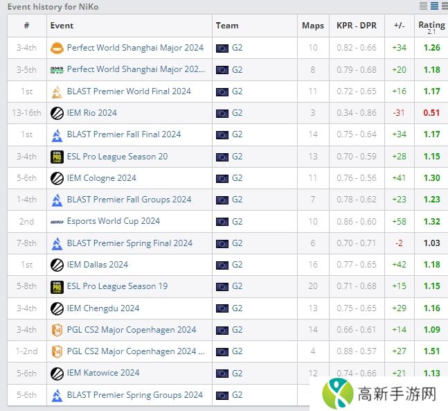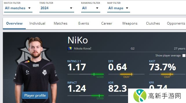 今年NiKo随G2获得了IEM 达拉斯、BLAST Premier秋决、BLAST Premier世界总决赛3个冠军。在这3个夺冠的赛事,MVP获得者都是他的队友m0NESY,NiKo在2024年获得了6个EVP提名(IEM 成都、IEM 达拉斯、电竞世界杯2024、BLAST 秋决、BLAST 世界总决赛和刚结束不久的上海Major)。他个人在2024年打出了平均1.17 rating。在183张地图上拥有0.74的每回合击杀,1+rating的占比达到69.4%。