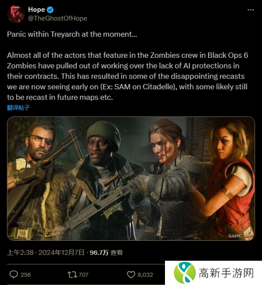 根据《使命召唤》消息泄露者 GhostOfHope 在社交媒体上发布的帖子称,由于动视政策缺乏对 AI 的保护,演员选择离开公司。他写道:“《黑色行动6》僵尸模式中几乎所有僵尸团队的演员都因为合同中缺乏针对 AI 的保护而推出了工作。这导致了我们现在早期看到的一些令人失望的重新选角(例如‘死亡堡垒’中的 SAM),并且未来地图很可能会看到更多重新选角。”