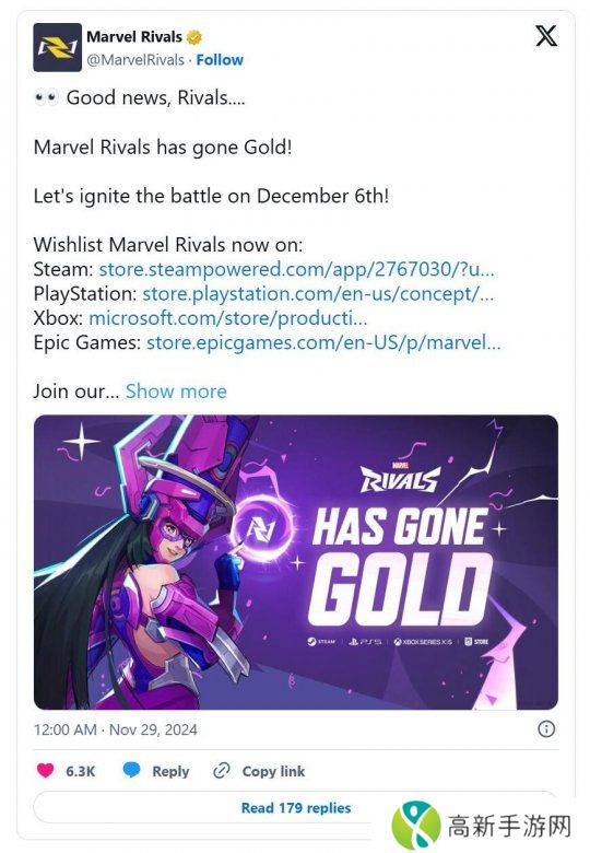 在发行前大约一周,网易的《漫威争锋》宣布已完成开发部分的所有工作(Gone gold)。这款免费英雄射击游戏将于12月6日在Xbox Series X/S、PS5和PC平台上推出,目前在Steam上最受欢迎的游戏中排名第六。