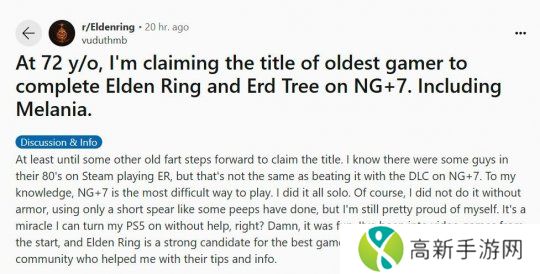 Reddit用户vuduthmb声称自己是完成《艾尔登法环》本体和《黄金树之影》DLC八周目难度的最年长玩家,这需要总共通关八次游戏。他开玩笑表示将一直卫冕这一这个头衔“直到其他老家伙站出来挑战。”《艾尔登法环》的多周目并不意味着一定会变难,但八周目确实相比一周目要困难很多。