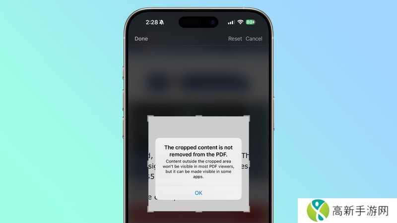 用户通过屏幕截图界面编辑 PDF 时,如果裁剪掉内容,苹果现在会发出警告,提示裁剪的内容并未从 PDF 中移除。
