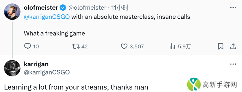 olofmeister在社交平台上称赞karrigan:“karrigan绝对是大师级的人物,指令太棒了。