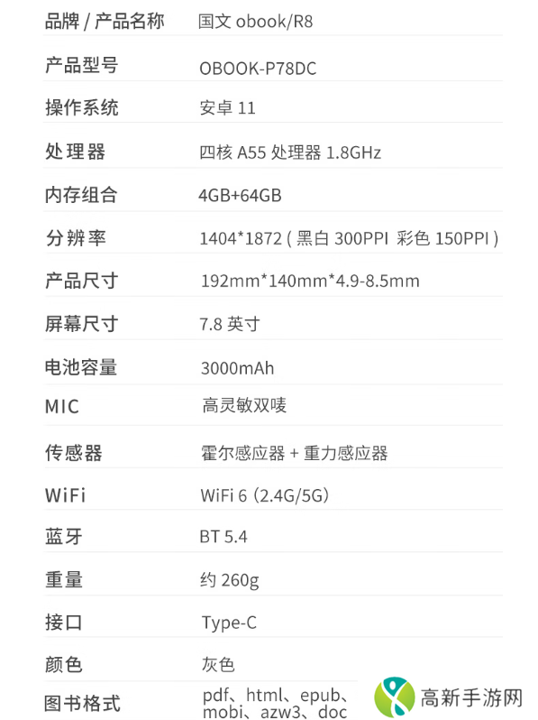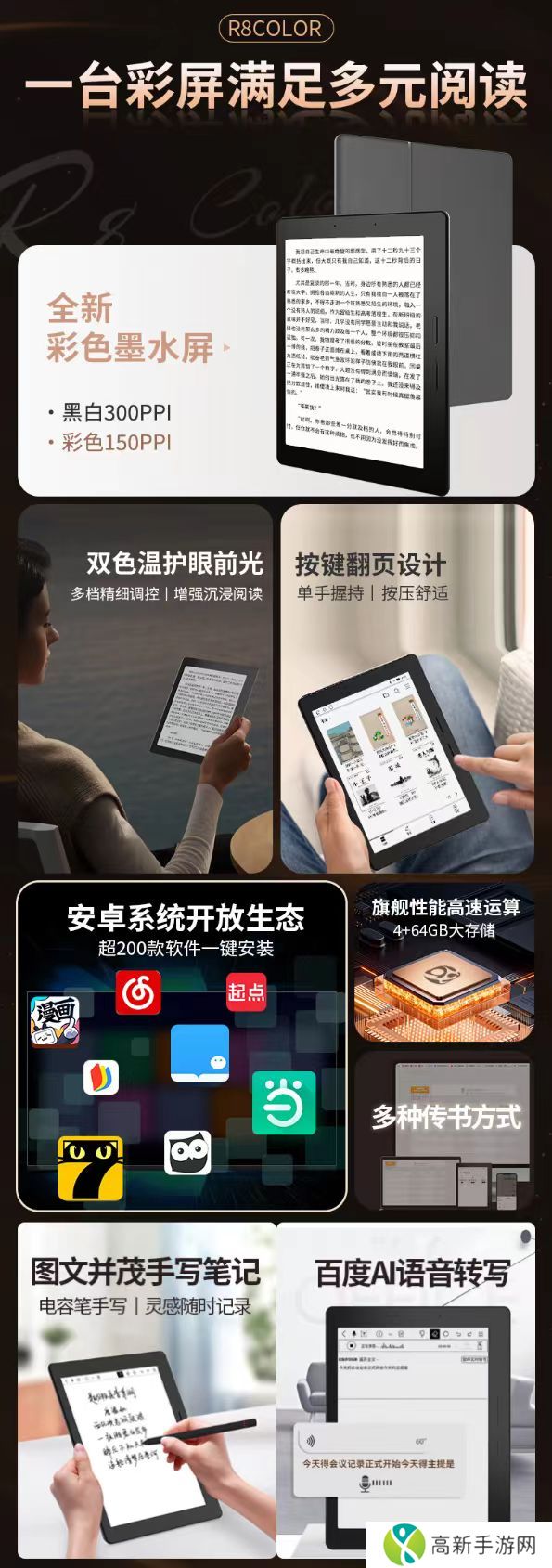 国文 R8 系列读写本配备 7.8 英寸墨水屏、拥有物理翻页按键,同时内置支持档位调节的双色温物理灯珠。读写本搭载 A55 四核处理器,预装安卓 11 系统,应用商店提供超 200+ 阅读软件。