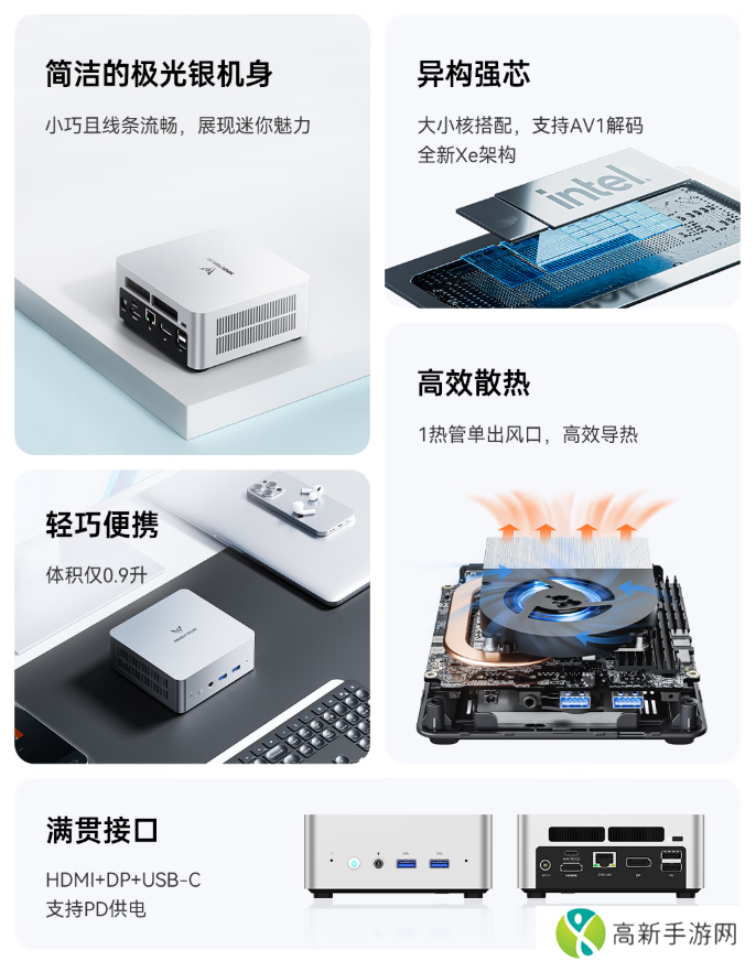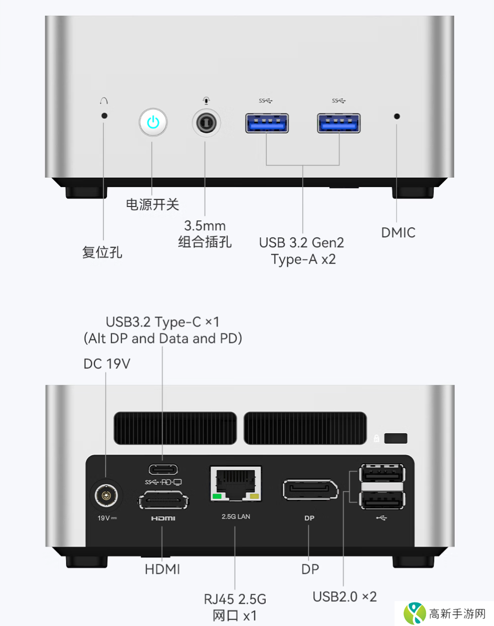 该迷你主机支持Wi-Fi 6E和蓝牙5.2,其正面配备1个 3.5mm音频接口、2个 USB-A 3.2 Gen 2接口;背面配备1个 USB-C 3.2接口、1个 HDMI接口、1个RJ 45 2.5G网口、1个 DP接口、2个 USB-A 2.0接口。