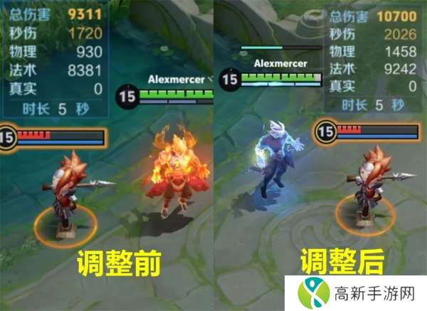调整前9311点伤害、调整后10700点伤害,六神装一套下来伤害比以前多了10%左右。
