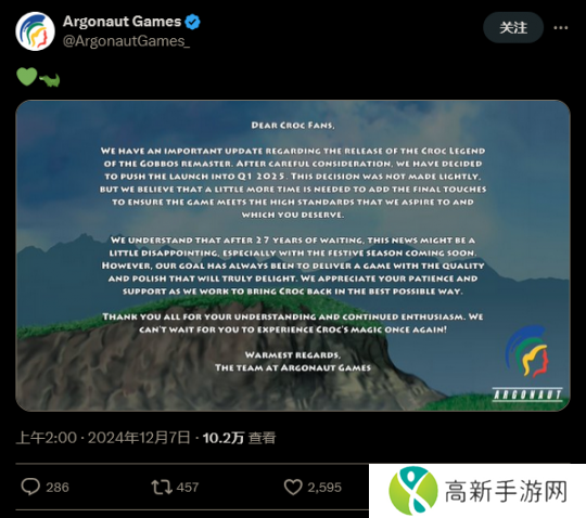 “我们的目标始终是提供一款真正令人愉悦的高质量和精美的游戏。我们感谢您的耐心和支持,我们正在努力以尽可能最好的方式让克拉鳄回归。”