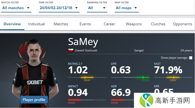Anonymo阵容加入Sangal,在效力期间的192张地图中平均rating为1.02,但他在线下赛事的表现明显下滑(27张地图平均rating为0.88),尤其是在对阵世界前20的队伍时表现尤为低迷(13张地图平均rating为0.81)。