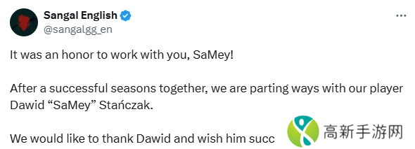 Sangal宣布了SaMey的离队,结束了这位波兰狙击手与队伍长达七个月的合作。