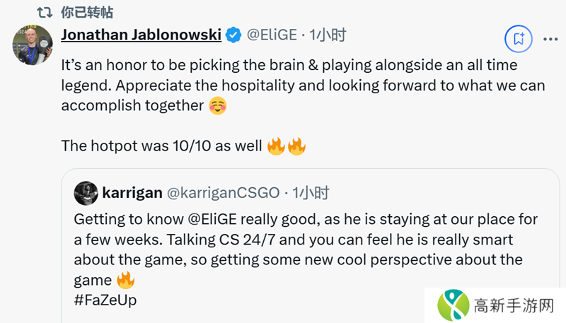 FaZe战队官宣签下EliGE作为战队新成员。而在今天karrigan在社交平台上发布动态,分享了自己和EliGE成为队友的感受。