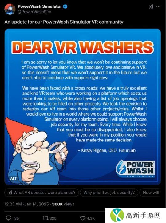 因此FuturLab的VR团队现已重新部署到“其他项目/角色”上。Rigden总结道:“虽然我希望生活在一个可以在所有平台上支持《冲就完事模拟器》的世界里,但我会始终为我的团队选择工作保障。每一次。虽然我知道你一定非常失望,但我也知道,如果你处于我的位置,你也会做出同样的决定。”