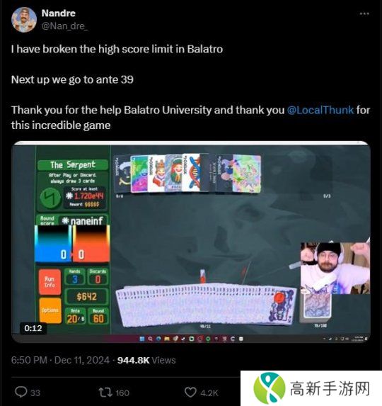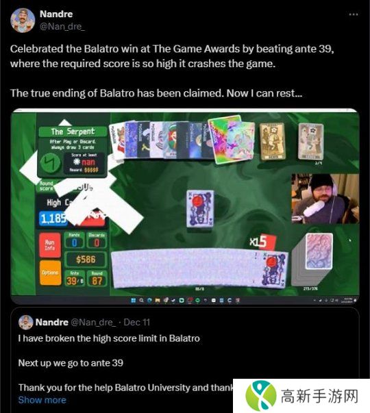 从视频中可以看到,“Nandre”在突破**39(ante 39)时,由于获得的分数太高,导致游戏发生了崩溃,达成了类似《俄罗斯方块》的“杀屏(killscreen)”,从而实现了通关《小丑牌》。