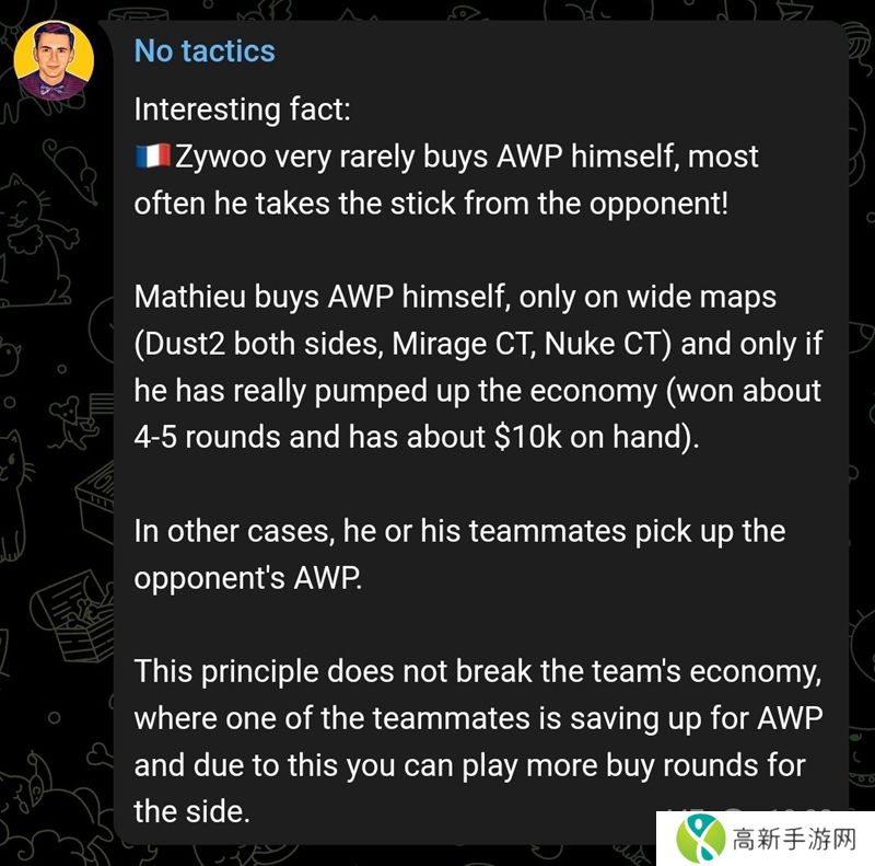 Spirit分析师在社交平台分享了自己关于ZywOo的有趣发现。他注意到ZywOo手中的AWP多数来自敌手。“有趣的事实:ZywOo自己很少购买AWP,大多数时候他都是从对手那里缴获!ZywOo只有在