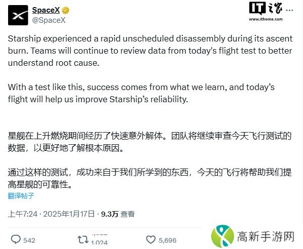 虽然超重型助推器成功回收,但火箭的上面级部分(本站注:也就是“星舰”本体)在飞行仅 8.5 分钟后就发生异常,遥测信号丢失,经确认是在升空过程中解体,没能释放模拟卫星,SpaceX 将在未来几天内发布进一步的分析数据。