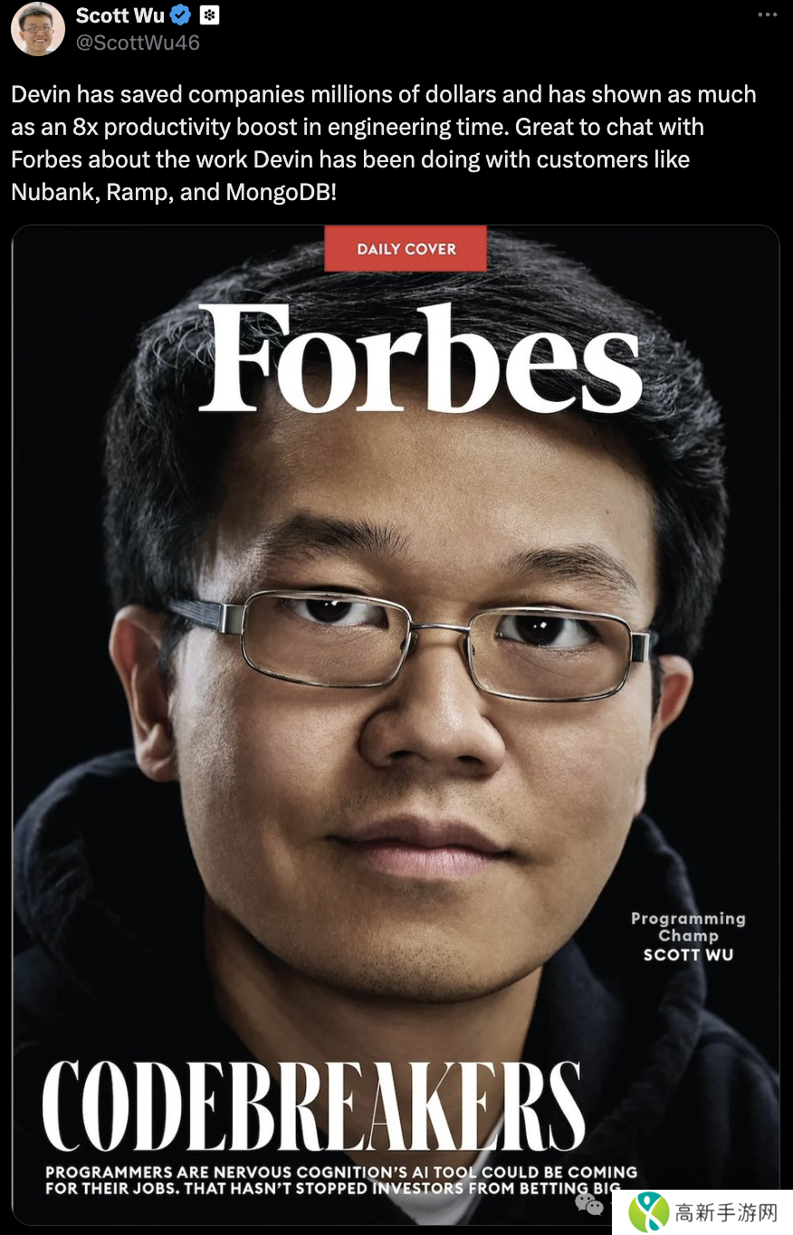「世界首个 AI 编码程序员 Devin,可以像『初级工程师大军』一样完成整个编程任务」。28 岁华人创始人,3 届 IOI 金牌得主 Scott Wu,在接受福布斯最新采访中坦言道。
