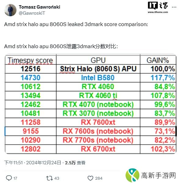 当前位置:首页>手游攻略> AMD Strix Halo APU 集成的 Radeon 8060S 核显 3DMark 跑分曝光