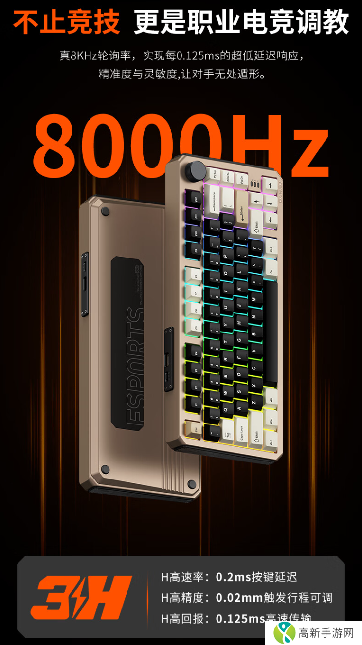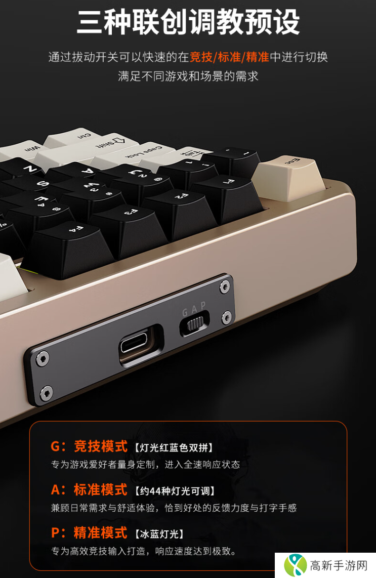 据介绍,达尔优A75HE 电竞磁轴键盘采用Type-C 接口有线连接,轮询率 8000Hz、延迟响应约 0.125ms、触发行程 0.02mm 可调。键盘后置拨动开关,可切换竞技 / 标准 / 精准三种模式。