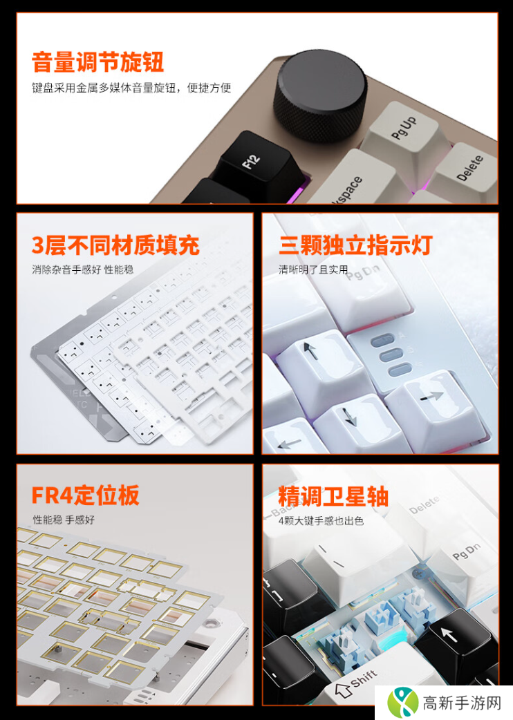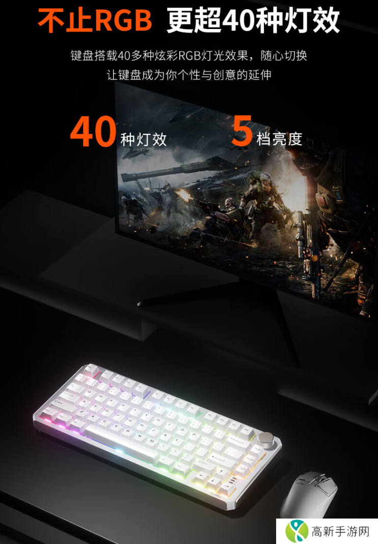达尔优A75HE 电竞磁轴键盘搭载 40 多种 RGB 灯光效果,支持5 档亮度可调。键盘使用 Gasket 结构,配备音量调节旋钮、拥有 3 颗独立指示灯。