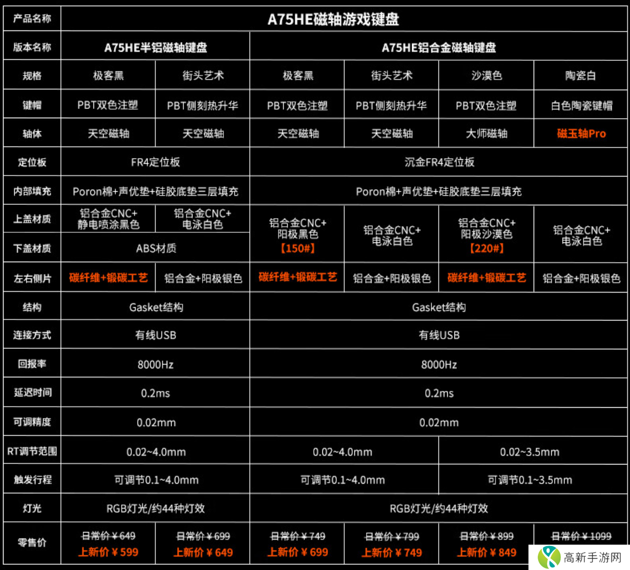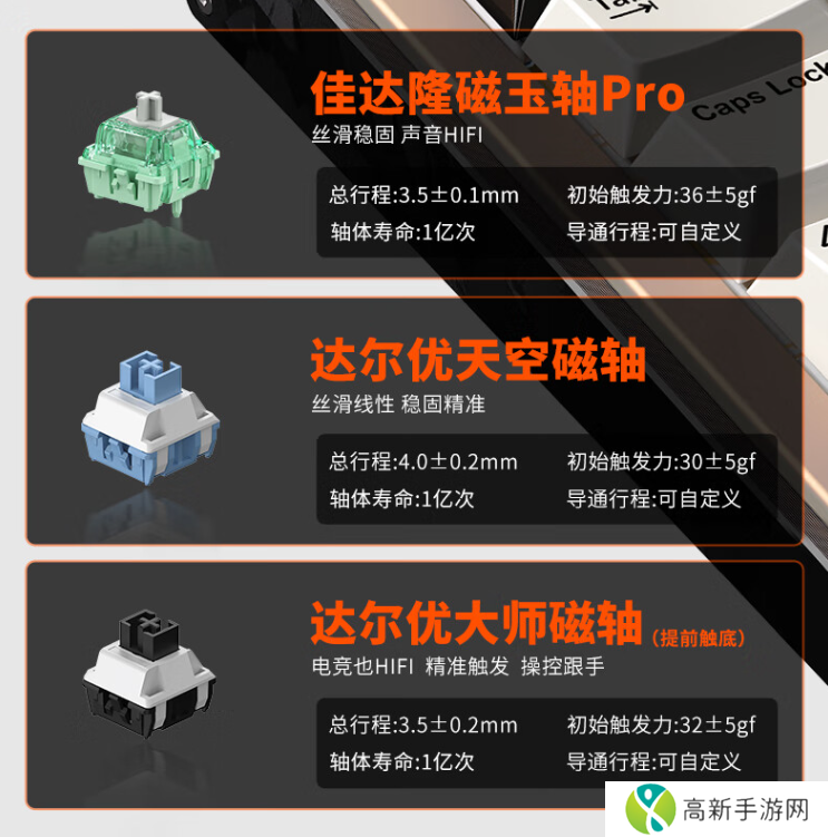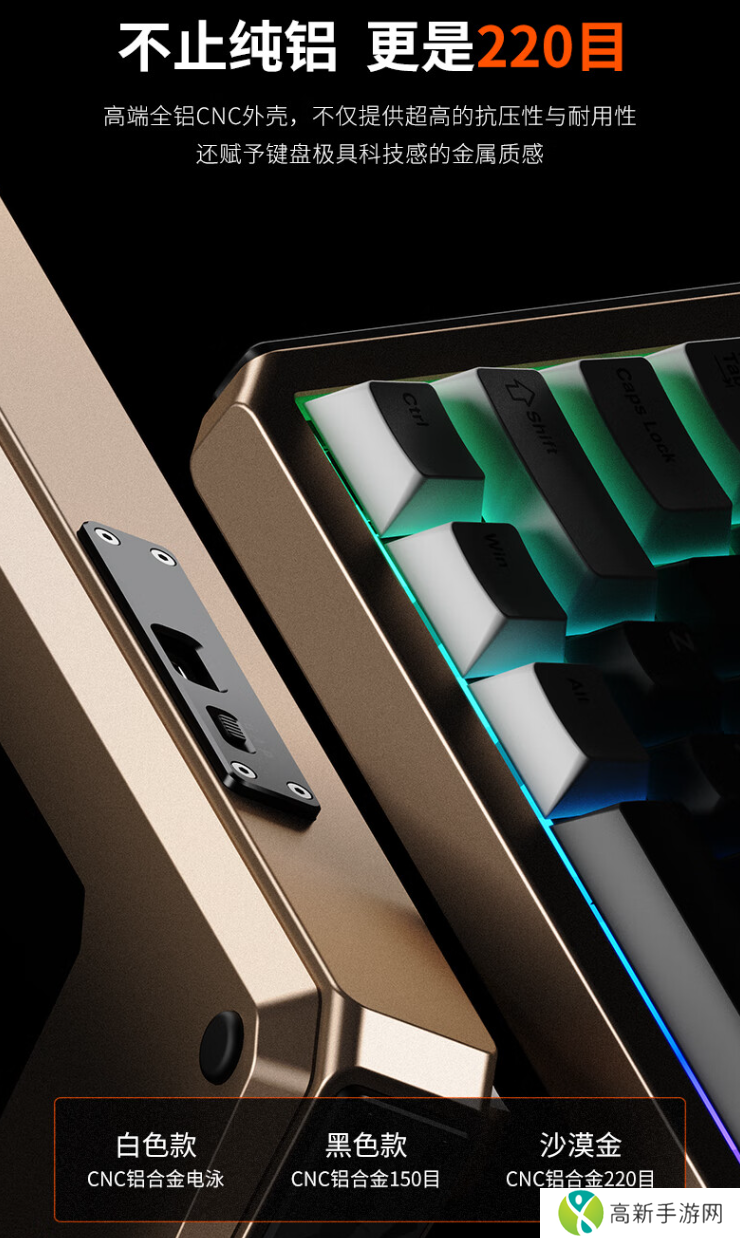 该款键盘提供佳达隆磁玉轴 Pro、达尔优天空磁轴、达尔优大师磁轴可选,外壳采用全铝 CNC(白色款:CNC 铝合金电泳;黑色款:CNC 铝合金 150 目;沙漠金:CNC 铝合金 220 目)。