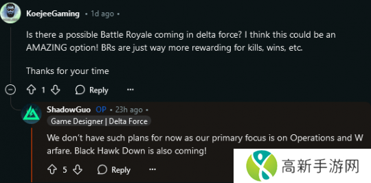 在日前于 Reddit 论坛上进行的问答环节中,《三角洲行动》制作人郭智(Shadow Guo)被问到,游戏未来是否会推出大逃杀。然而非常迅速地他就否决了这个想法。