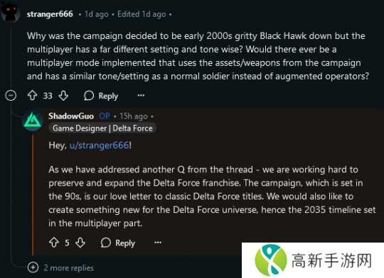 在回答另一个问题时,郭智谈到了该战役的背景和主题背后的灵感,它与多人模式的设定有所不同,并且他还希望借此向以往的《三角洲》游戏致敬。