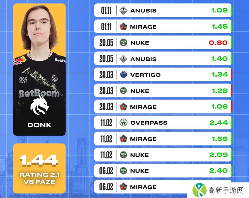 donk在今年对阵FaZe的比赛中都保持着极佳的手感,FaZe似乎始终无法找到遏制这位新星的有效办法。donk今年对阵FaZe的平均数据Rating高达1.44,其中在IEM 卡托维兹的决赛中更是打出了极为夸张的1.96 Rating。